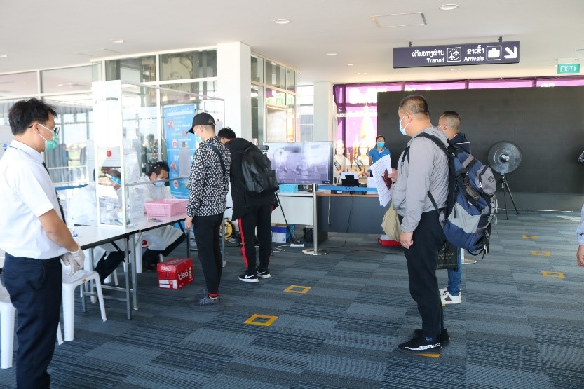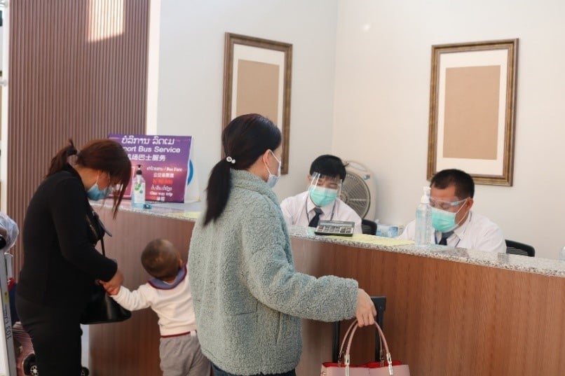 Passengers queue at a counter inside the terminal to buy bus tickets as designated bus companies are operating the services that will take them to their quarantine hotels at a fee of LAK 50,000 each.