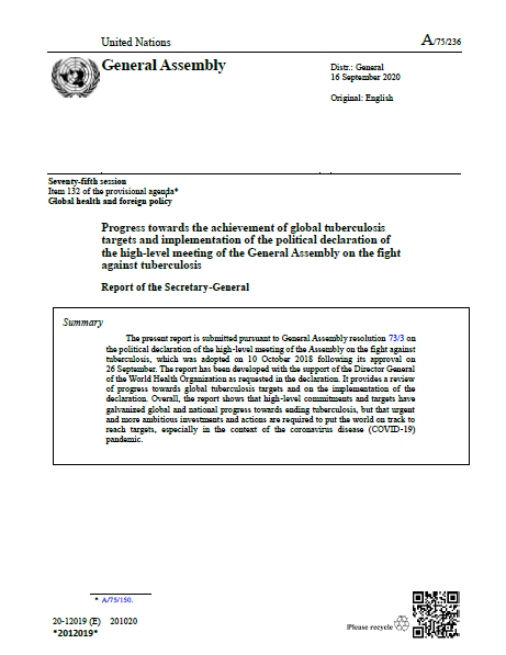A new report has been released today by the United Nations Secretary-General António Guterres, titled Progress towards the achievement of global tuberculosis targets and implementation of the political declaration of the high-level meeting of the General Assembly on the fight against tuberculosis. The report stresses that high-level commitments and targets have galvanized global and national progress towards ending TB, but urgent and more ambitious investments and actions are required, especially in the context of the COVID-19 pandemic. The report was developed with the support of the Director General of the World Health Organization (WHO) as requested in the political declaration of the 2018 UN High Level Meeting on TB.